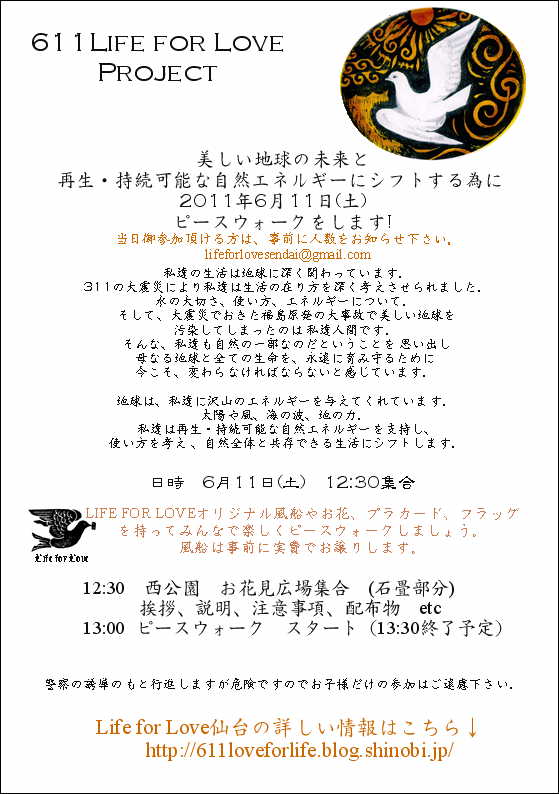 私達LIFE for LOVE SENDAIは、反対、対立は望んでいませんので 趣旨にご賛同頂ける方のみご参加頂けますよう お願い致します。 当日の確認してほしいことと注意してほしいこと 611に東京で行われるエネルギーシフトパレード「エネパレ」ブログ参照」 ※当日、ピースウォークの様子をネットで配信する予定やメディアの取材も ある可能性があります。 ご了承のうえ、ご参加お願い致します。 <ご注意です> ●こどもさんはなるべくマスクをしてくださいね。 ●暑い時期は飲み物などを用意して、脱水症状にきをつけましょうね。 ●小さなお子さんをお連れの方は、長い距離を移動するのでベビーカーをご持参で! ●車道をあるきます。通行中の車や他の通行されてる方にご迷惑にならない様に 当日の隊列を守って歩きましょう! ●お車でのご参加は出来ません。一輪車も、インラインスケートも、ゆっくり走ると不安定になるものは ご遠慮くださいね。 ●パレード途中での参加及び離脱は原則的にできません。 距離は長いですが、最後まで気持ちを込めて歩きましょう。 ●途中でケガや気分の悪くなった方はすぐに周りのスタッフに伝えてください。 ●パレード中の食事(!)・喫煙・飲酒・チラシ配布はご遠慮下さい。ごみは捨てないでください。 ●安全の為に、パレード中の歩く場所など、警察の指示に従いましょう。 ●スタッフの指示に従っていただけない場合はパレードへの参加をご遠慮いただく場合もございます。 <確認です> 今回のエネルギーシフトパレードは「個人の自発的な参加」が基本です。 年齢・性別・宗教・国籍は問いません。 表現方法についても、特に制約はありませんが、 この問題は、あらゆる面で非常にセンシティブです。 ほんのちょっとした事から誤解・反発を招く可能性があります。 威圧的、暴力的な風貌やメッセージを掲げる方の参加はお断りしています。 「反対・対立」を越えて 「対話・共存・相互理解・思いやり」の実現を目指す パレードの趣旨をご理解頂き、 「自分に責任を持って発言・行動する」 ことを踏まえた上でご参加ください。 <それから・・・> 運営側では、パレードに参加される方々のプライバシーに配慮し、 パレードを撮影される方々に事前に声をかけていただくなどの対策を できるかぎりお願いいたします。 しかし、すべての映像を運営側でコントロールすることは難しく、 報道やWebサイトなどで参加者の姿が撮影された写真・映像が掲載される事があると予想されます。 パレードに参加される場合には、事前にご了承ください。 |
